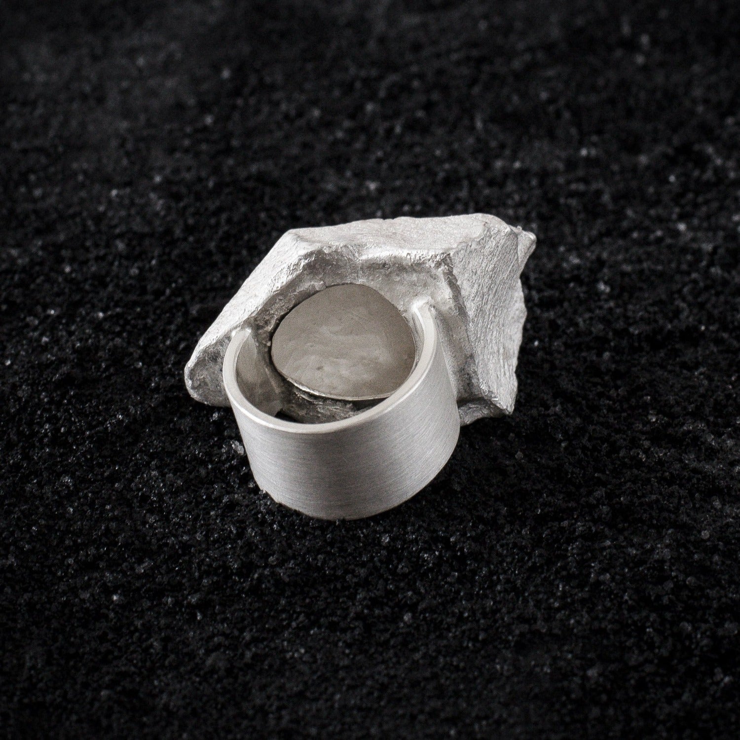Der X Ring ist definitiv ein Statement Ring. Aus einem in Südafrika gefundenen Stein gegossen und zur Gewichtsreduzierung hohl gearbeitet. Hergestellt aus 925 Silber. Die Ringschiene ist flach und breit, um ein Umkippen des Rings zu verhindern.