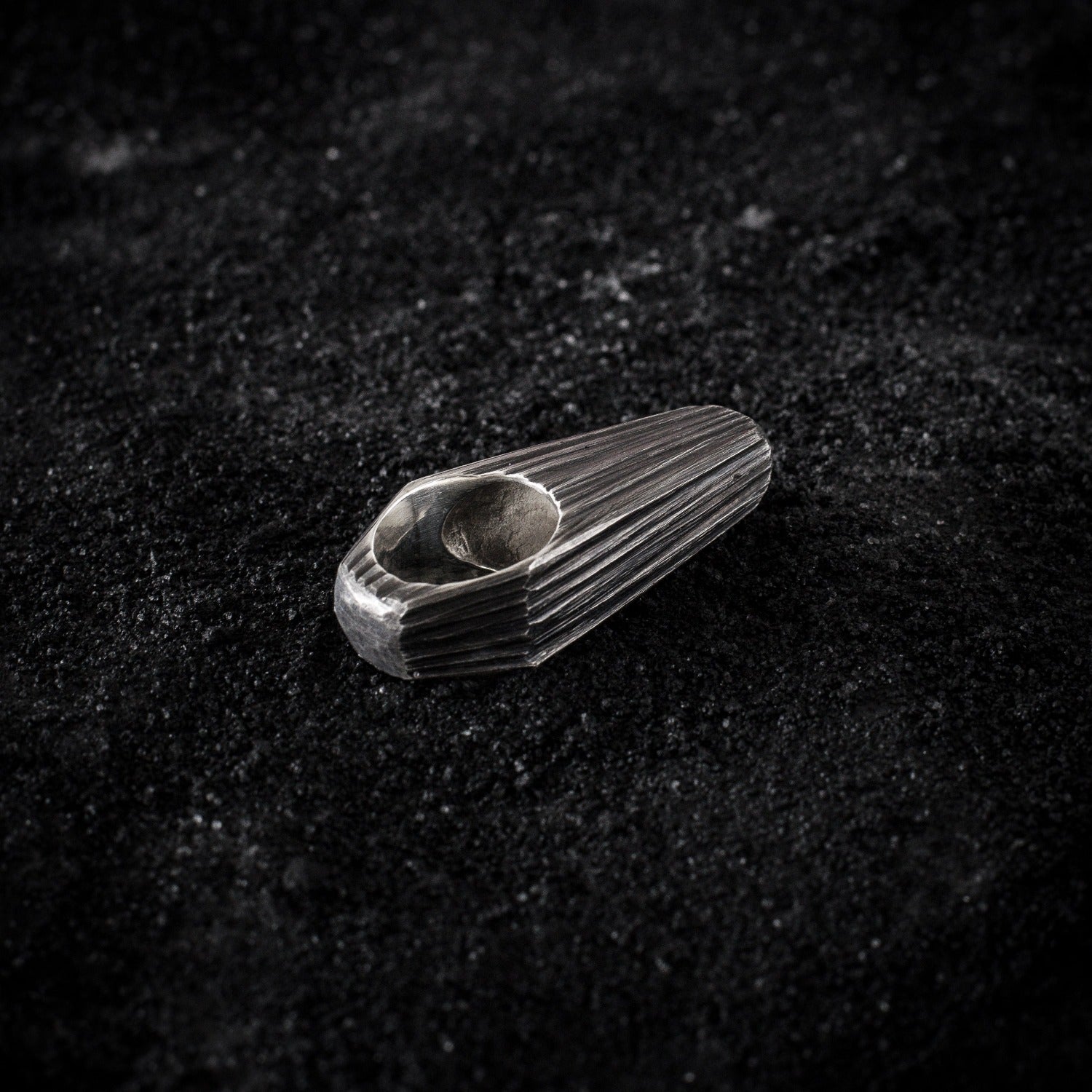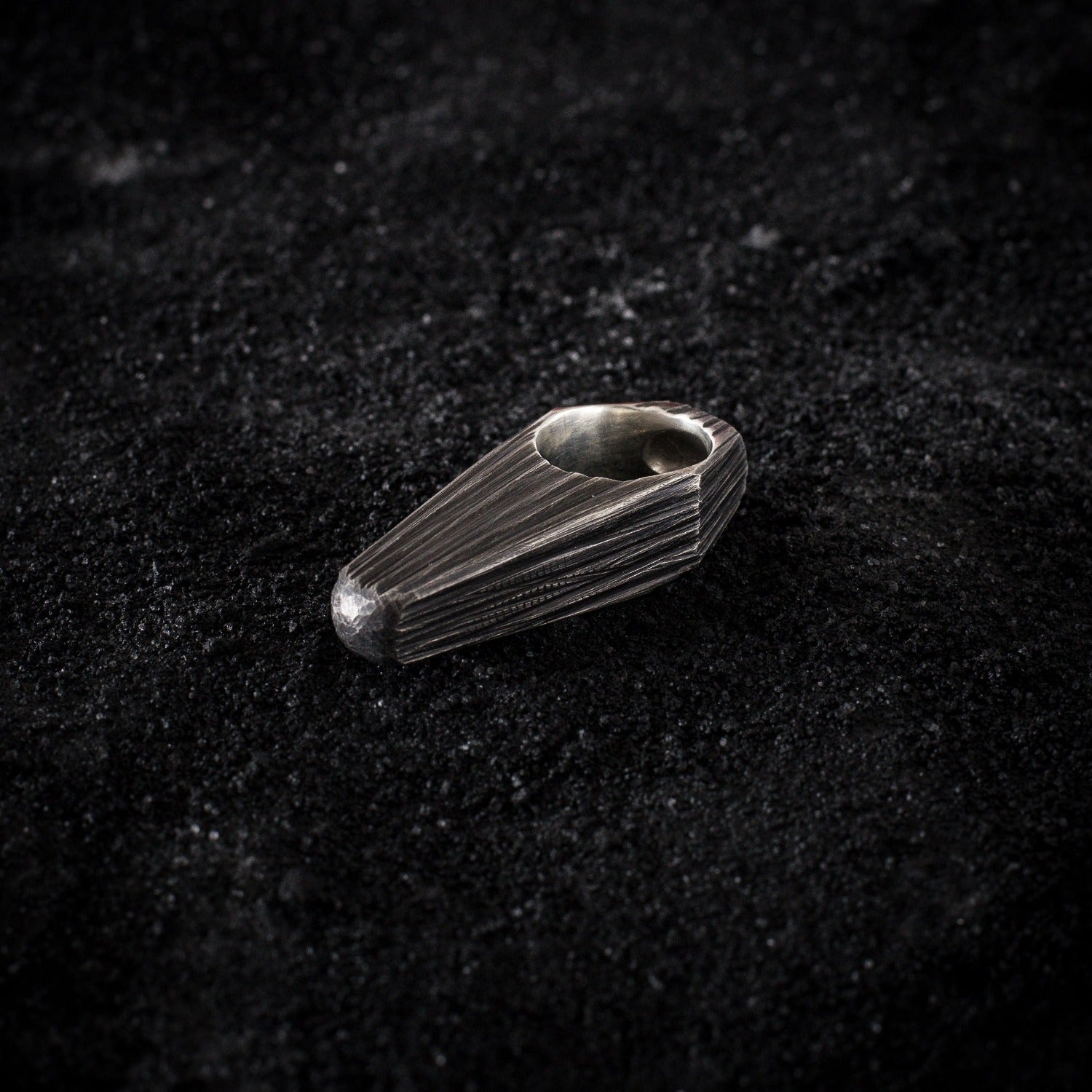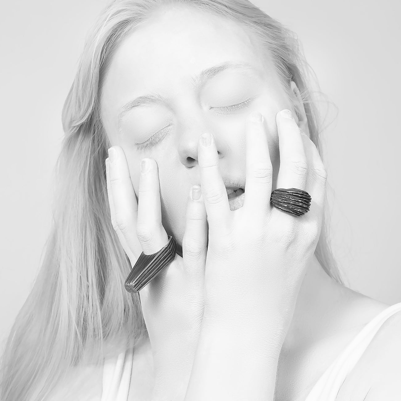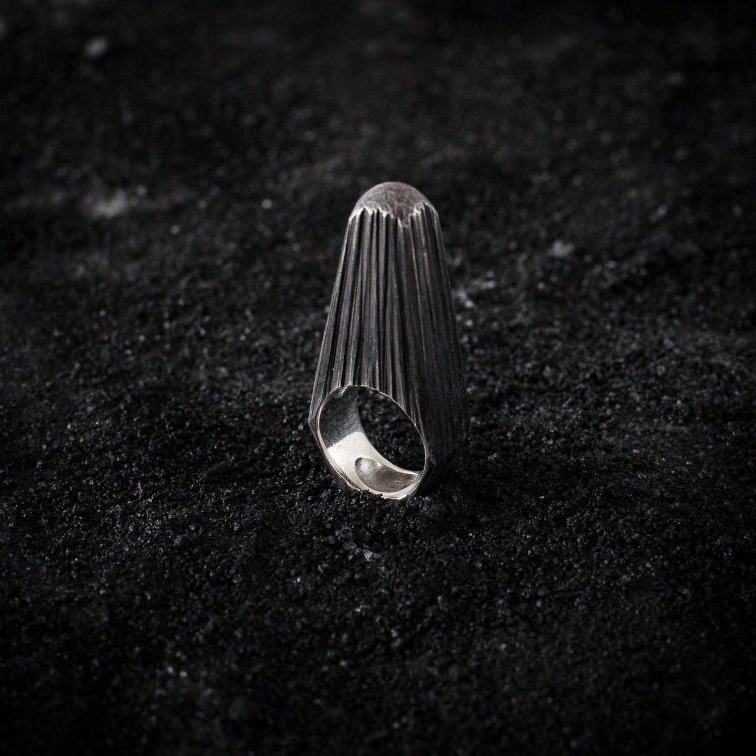 Carved, casted into sterling silver and oxidized. The surface is streaky, rough and matt, polished on the inside of the ring rail. Worked hollow to reduce the ring's weight.
