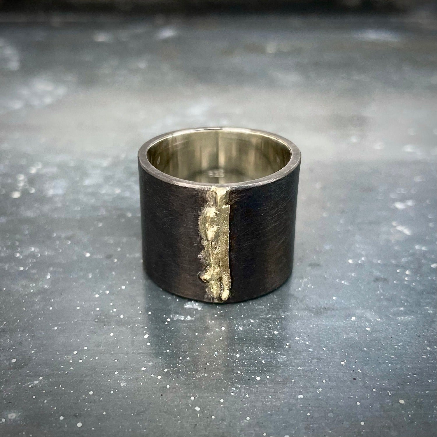 RIV ring means River ring. The finger piece is made from oxidised sterling silver, with a 18 kt yellow gold segment.