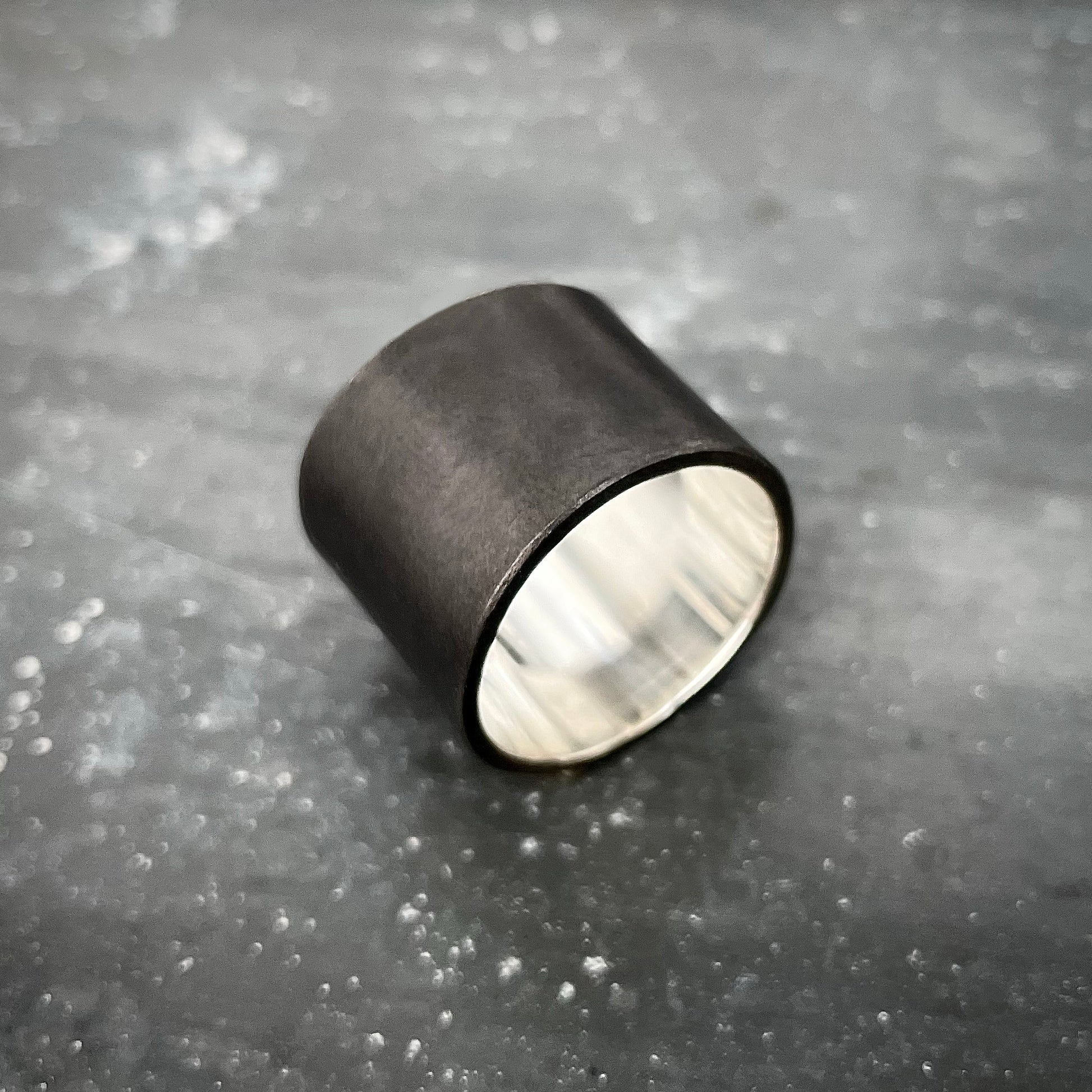 This distinctive detail on the ring's forehead, is an exaggerated soldering scar. The ring is worked slightly conical, according to our finger's shape. The back side is slightly more narrow, to make the wide ring suit comfortable. The inside is highly polished for an extra smooth fit.