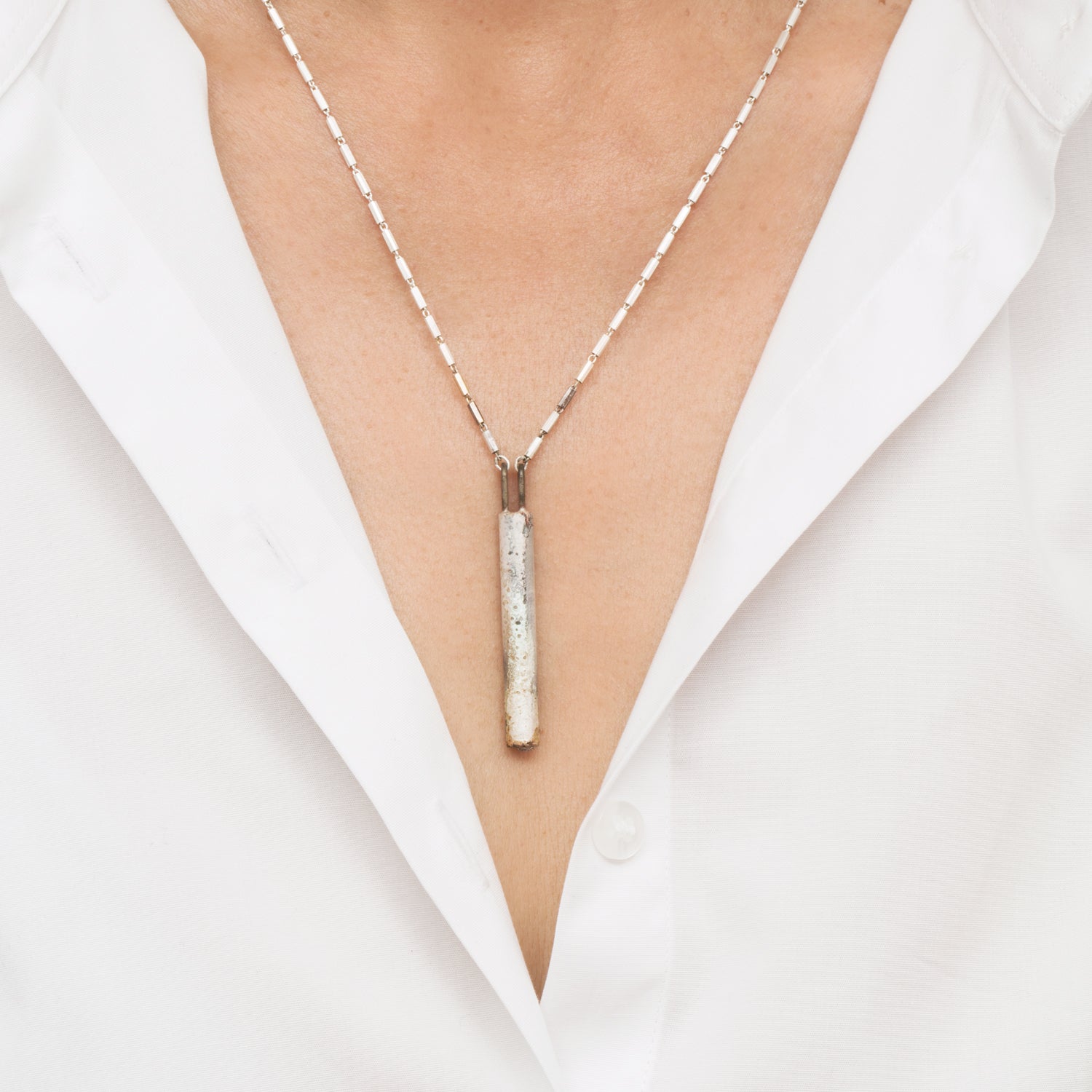 The amulet is casted roughly with offcut silver pieces. Colors, stains and irregularities that appeared by coincidence in the working process are kept on purpose. While the design will differ slightly with each pendant, the colorfulness will fade away with wearing the piece, what stays some day is the blank silver.